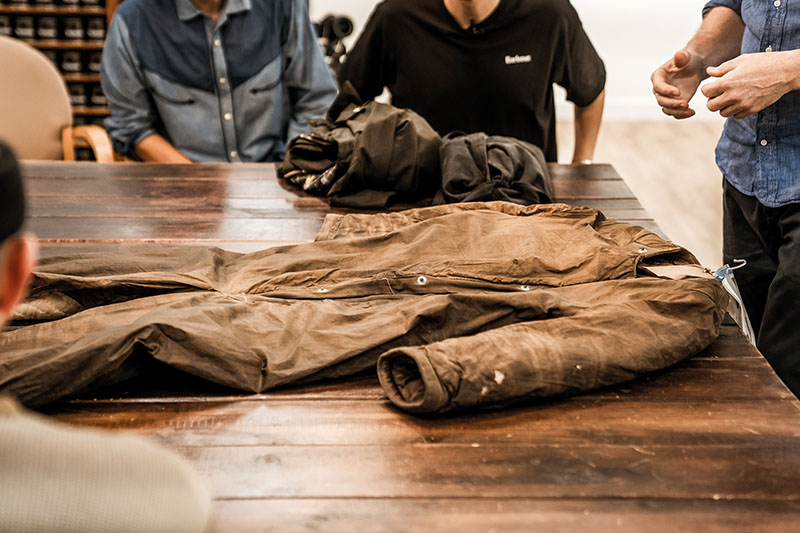 Tijdloos is een understatement bij Barbour. In de archieven van het familiebedrijf vind je jassen van meer dan 100 jaar oud die er nog verrassend actueel uitzien door hun functionaliteit en hun eenvoud. Zoals de Findlay, een cape uit 1910, gemaakt van robuust katoen uit Nieuw Zeeland en behandeld met olie. De cape was bedoeld voor bierhandelaars die aan huis leverden met paard en kar. Met de twee openingen voor de armen konden ze de teugels vasthouden terwijl ze voor de rest toch helemaal beschermd bleven bij regenweer. Heel anders is de Haydon-jas uit 1911, een lange mantel met een dubbele sluiting. De jas was 100 jaar binnen de Macpherson-Fletcher familie gebleven en werd uiteindelijk geschonken aan Barbour. Het is een eenvoudig model met herkenbare details zoals de kraag van katoenfluweel, de beschermingsflap voor de hals zodat je geen sjaal hoeft te dragen en de grote zakken waar je van alles in kwijt kon, elementen die je nu nog in de huidige modellen terugvindt.